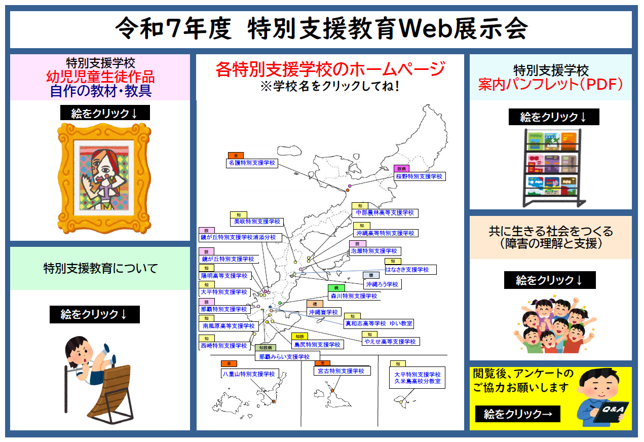県内の特別支援学校に通っている幼児児童生徒が制作した作品や子どもの実態に合わせて作られた教材教具、各特別支援学校の学校紹介リーフレットなどが閲覧できます。是非、この機会にご覧下さい。